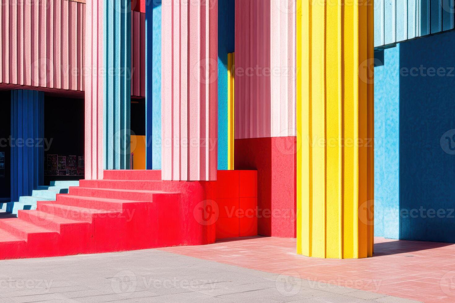 Vibrant architectural columns and colorful steps in a lively urban setting during daylight Pro Photo
