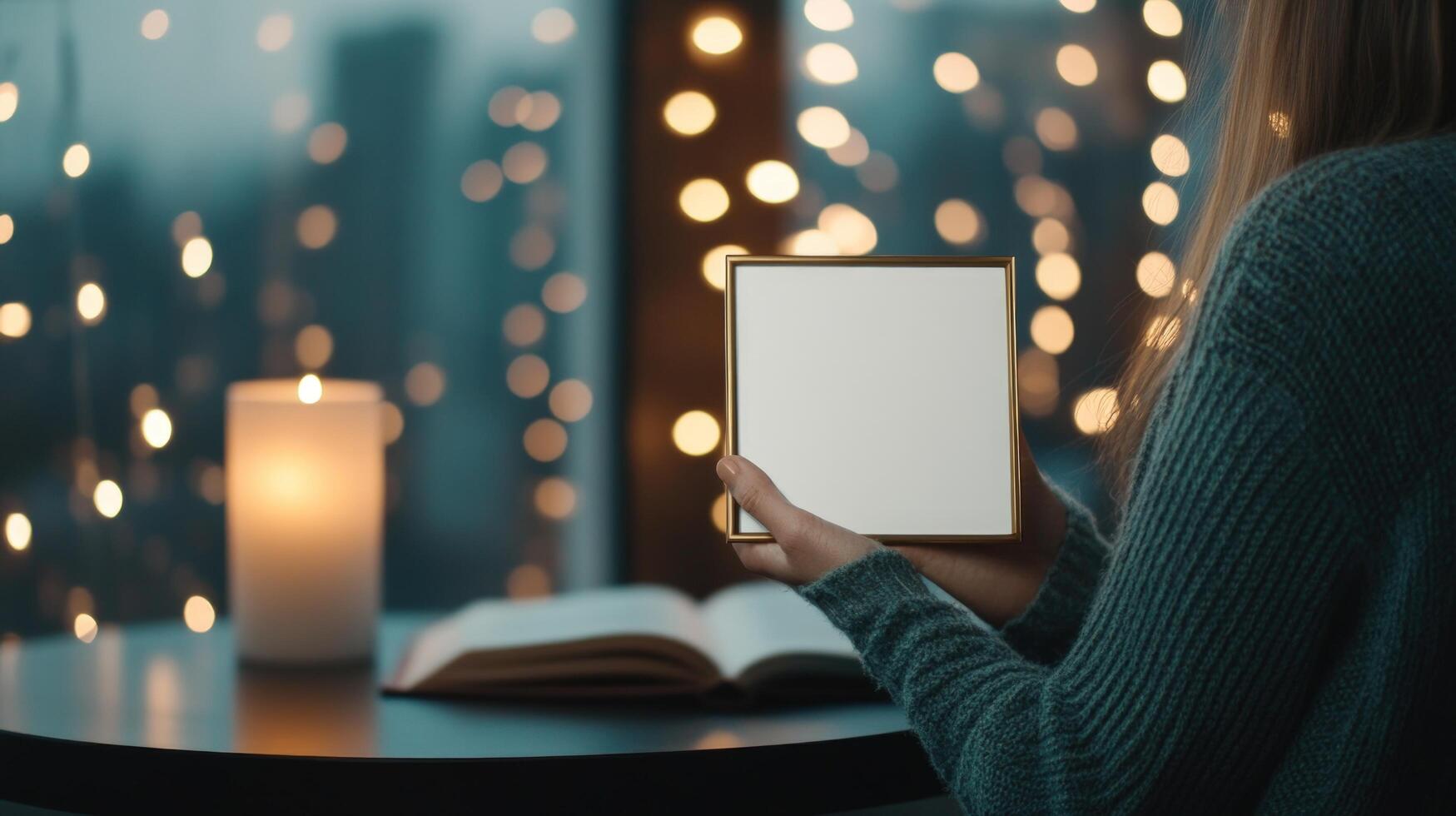 Blank frame held by person with candlelight and bokeh background for message or display photo