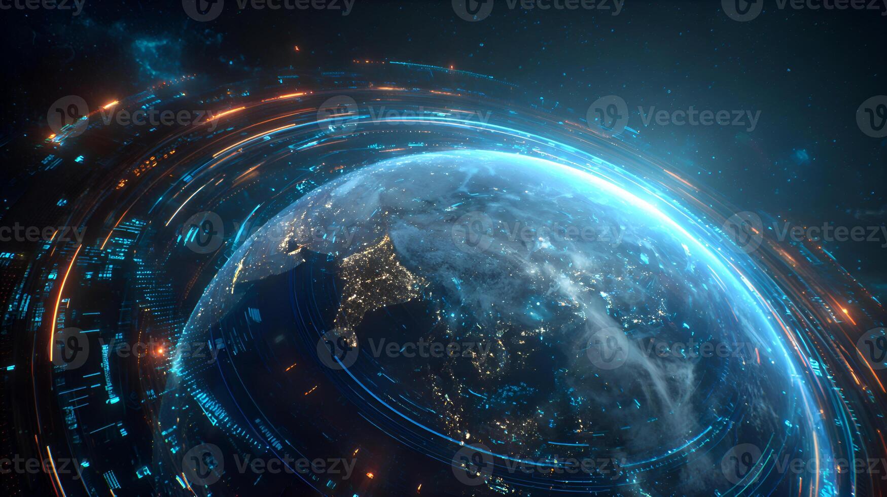 Planet earth rotating in space with futuristic digital data visualization interface surrounding it Pro Photo