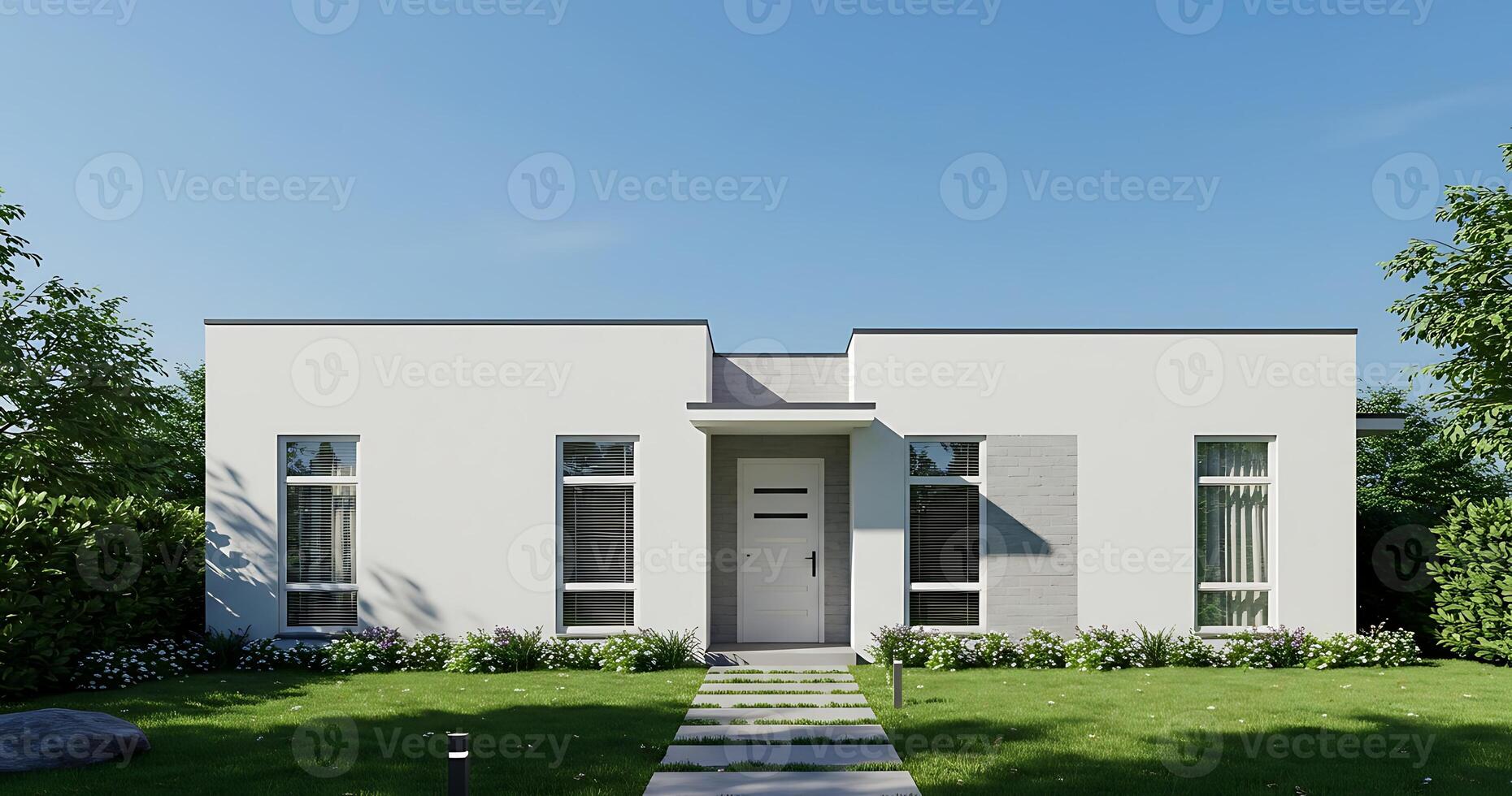 A rendering of a modern house with a lawn and trees Pro Photo