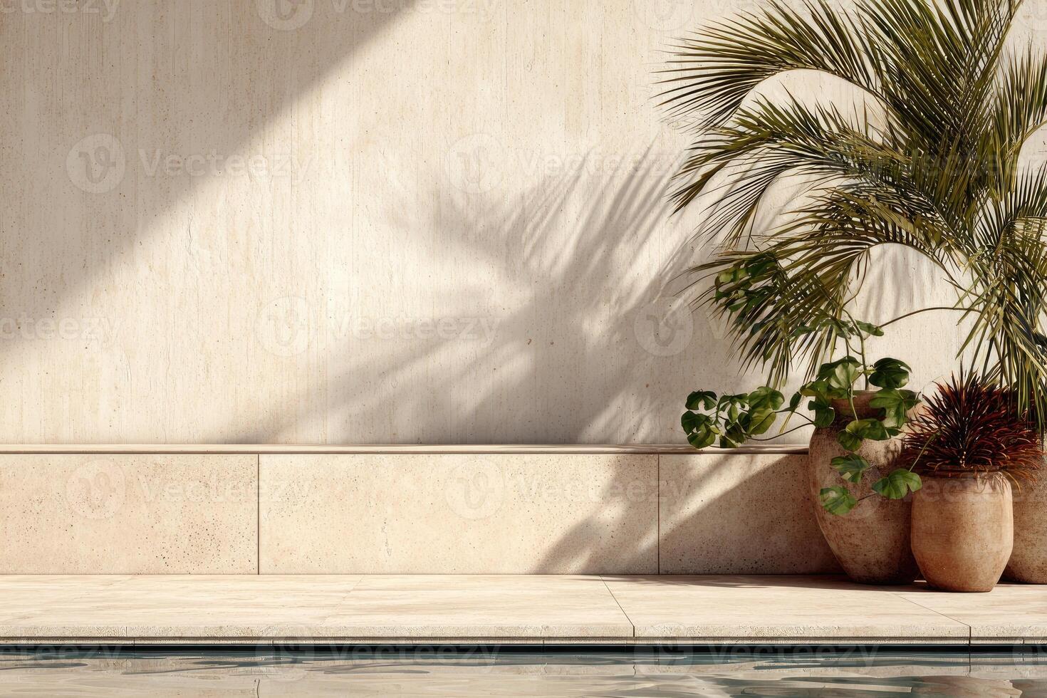 A pool with a palm tree and two pots Pro Photo