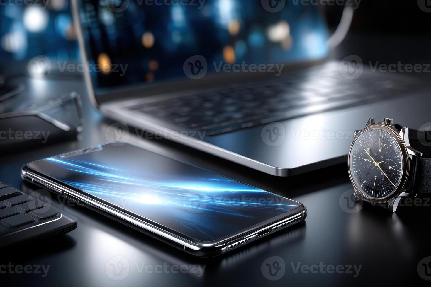 Modern workspace with smartphone and laptop, creating a high-tech environment Pro Photo
