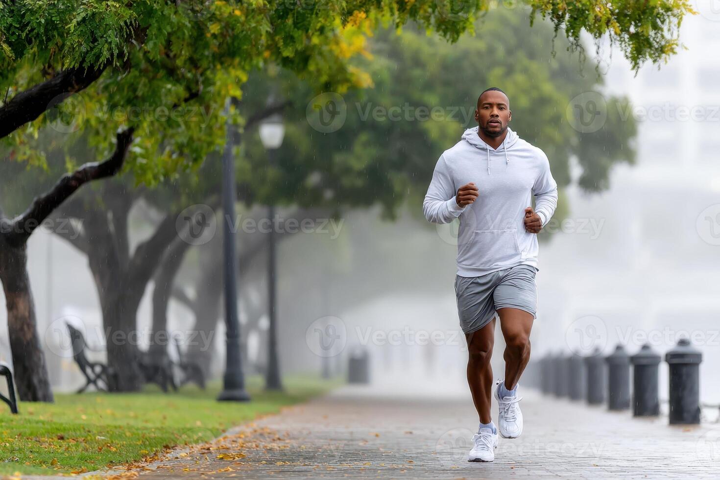 Man jogging in the rain on a paved path lined with trees and benches Pro Photo
