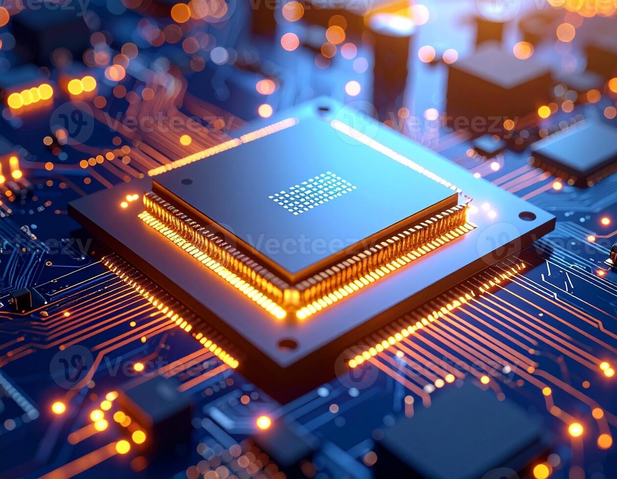 Advanced Microchip Technology Glowing Computer Processor on Circuit Board. Pro Photo