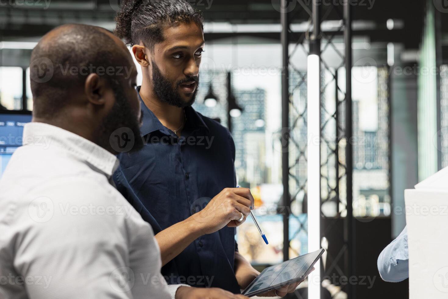 Team of property developers evaluating construction design and 3D models to create layout blueprints, zoning regulations for site preparation. Colleagues working on residential project. Pro Photo