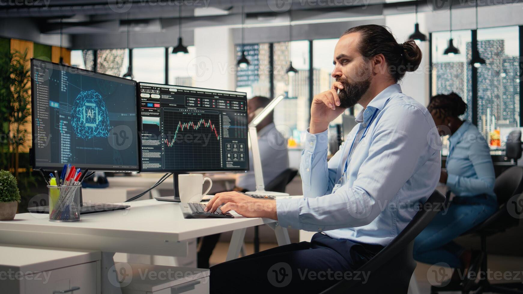 Day trader in office leverages AI analytics to interpret candlestick charts, optimizing buy and sell decisions. Stockbroker uses machine learning to maximize profit with automated strategies Pro Photo