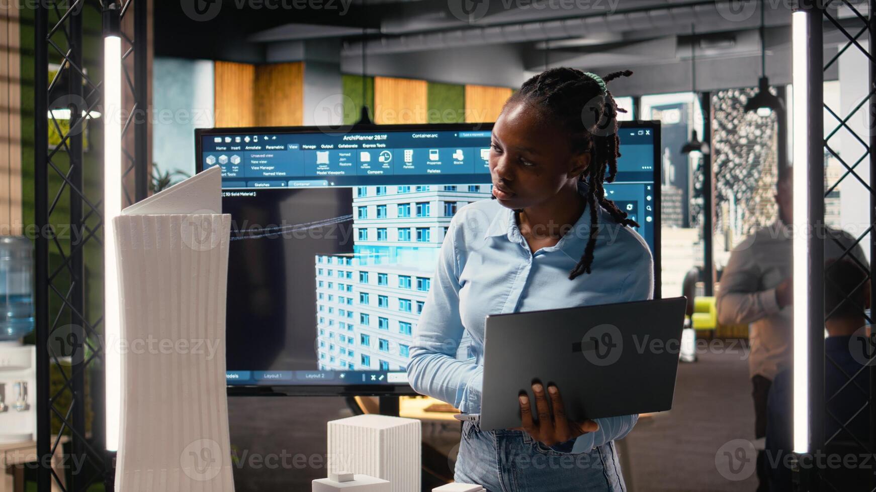 African american female evaluating 3D building model for measurements, creating construction blueprints for layout and preparing documentation for approval on a residential project. Pro Photo