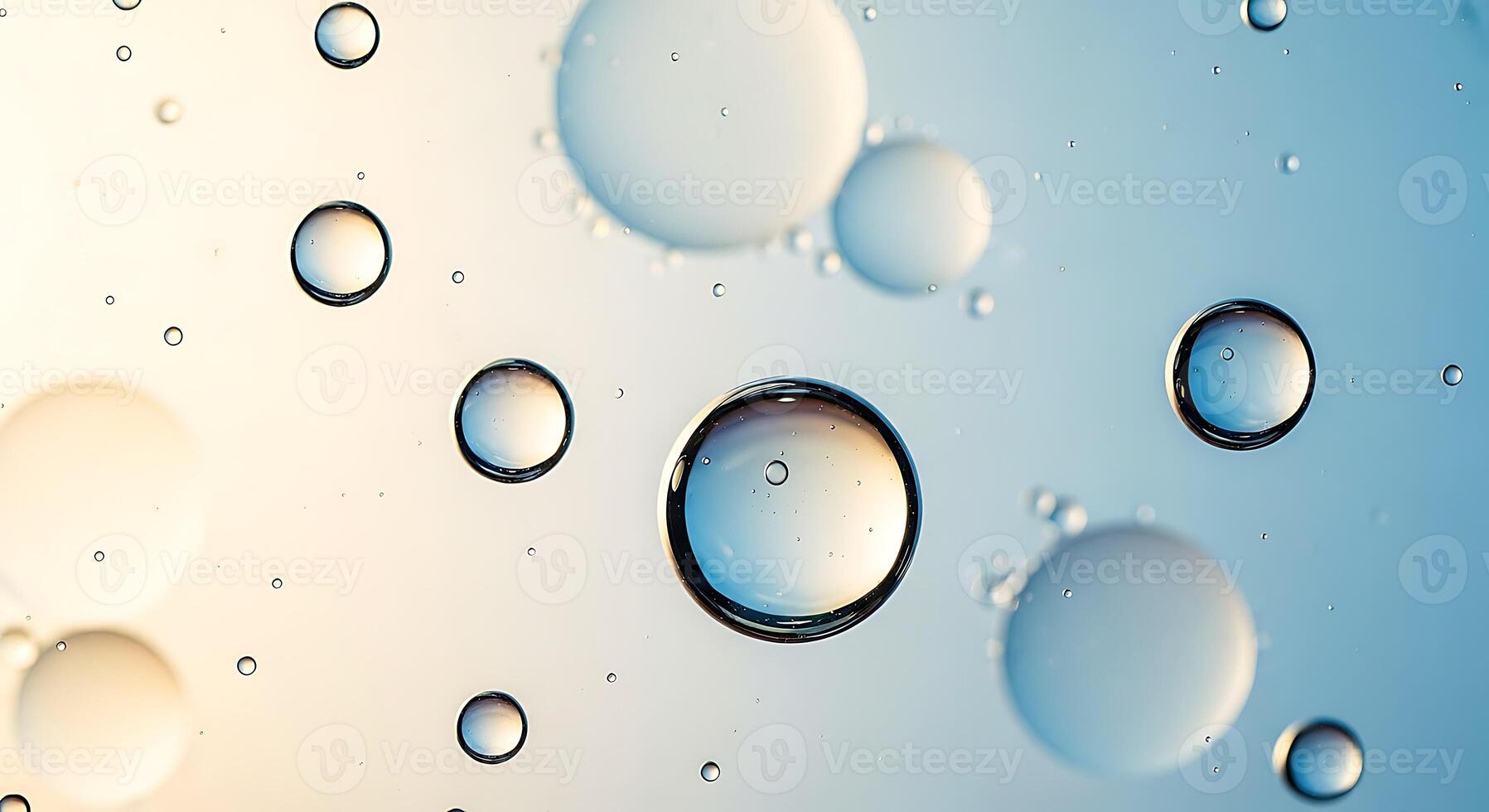 Macro View Of Liquid Droplets In Water Against A Gradual Blue And Yellow Background, Creating A Soothing Abstract Pattern. Pro Photo