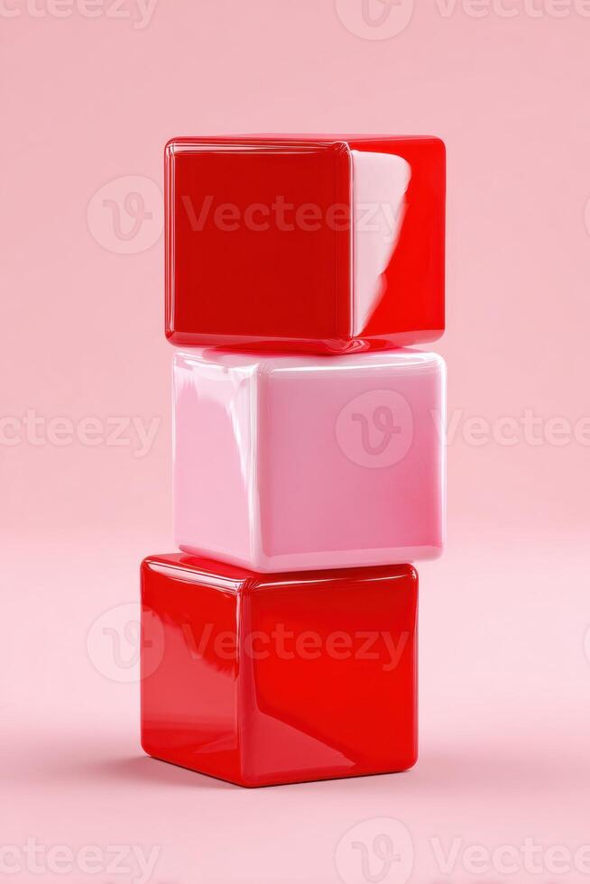 Stack of glossy and matte red and pink cubes creating a vertical structure on pink background Pro Photo