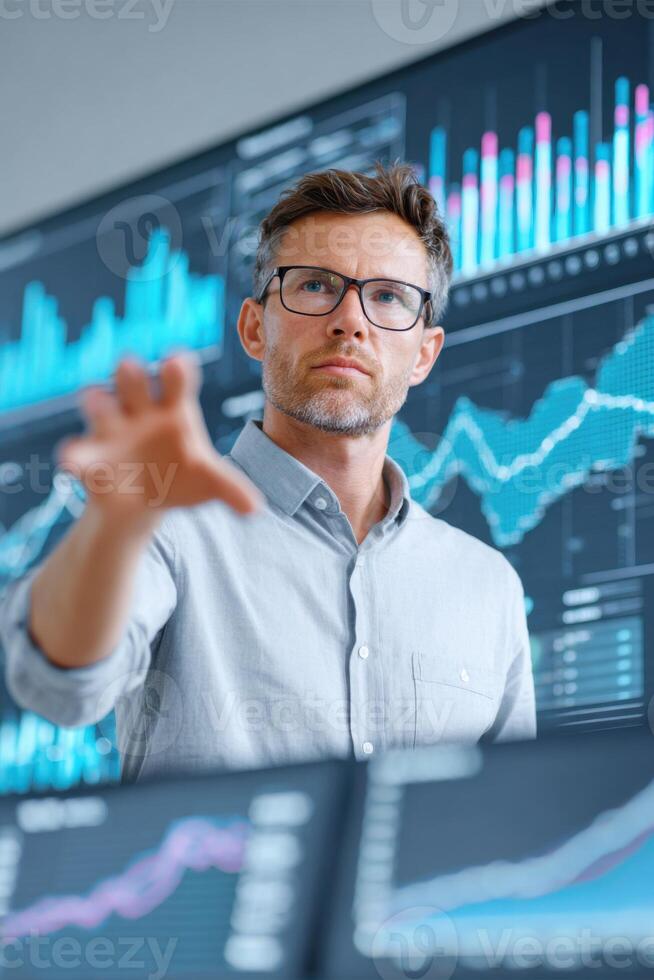 Financial analyst presenting interactive financial data analysis dashboard showing graphs and charts Pro Photo
