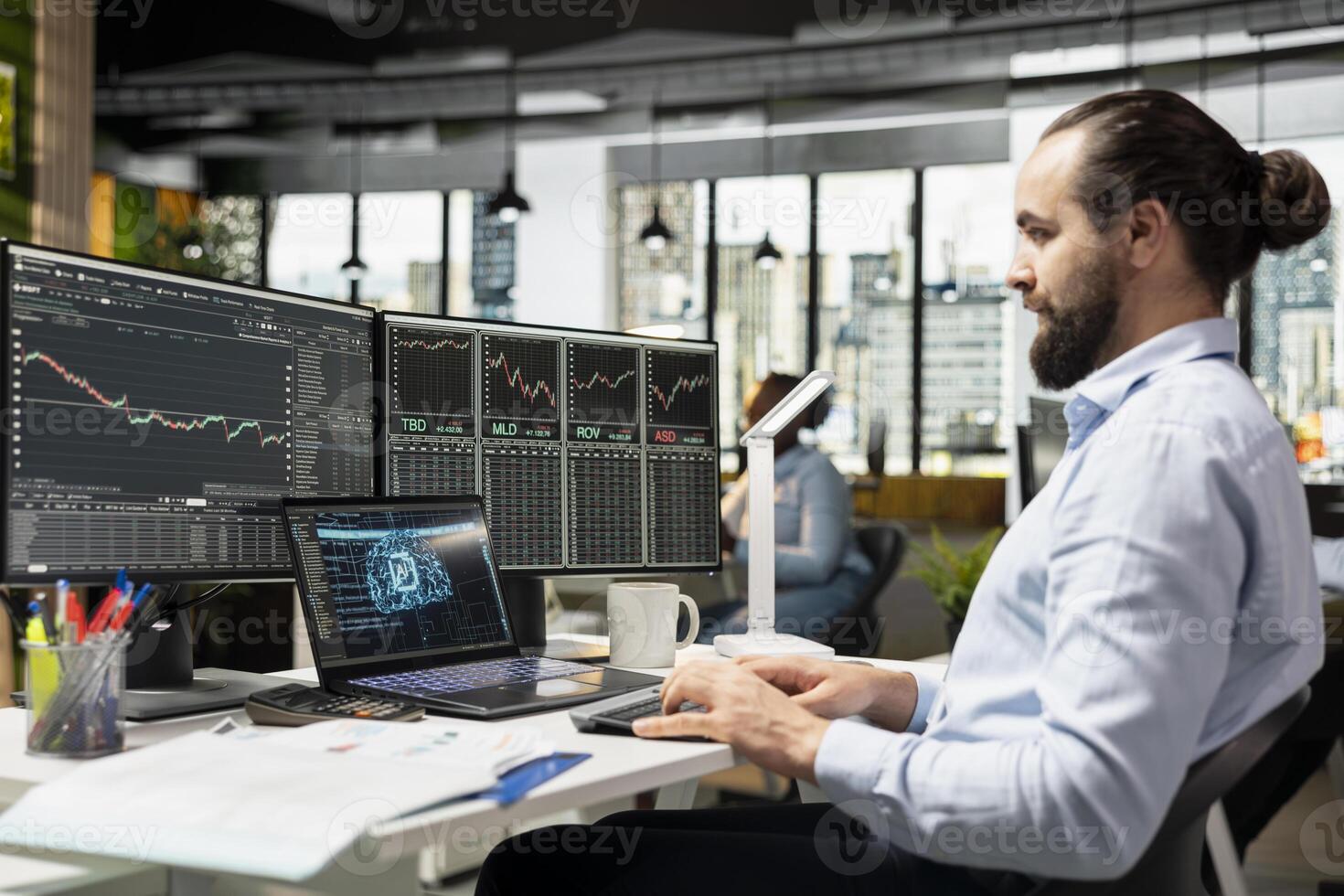 Trader running AI powered tools on laptop for automated trading and portfolio rebalancing. Man applying deep learning algorithms using notebook software to analyze complex market data Pro Photo
