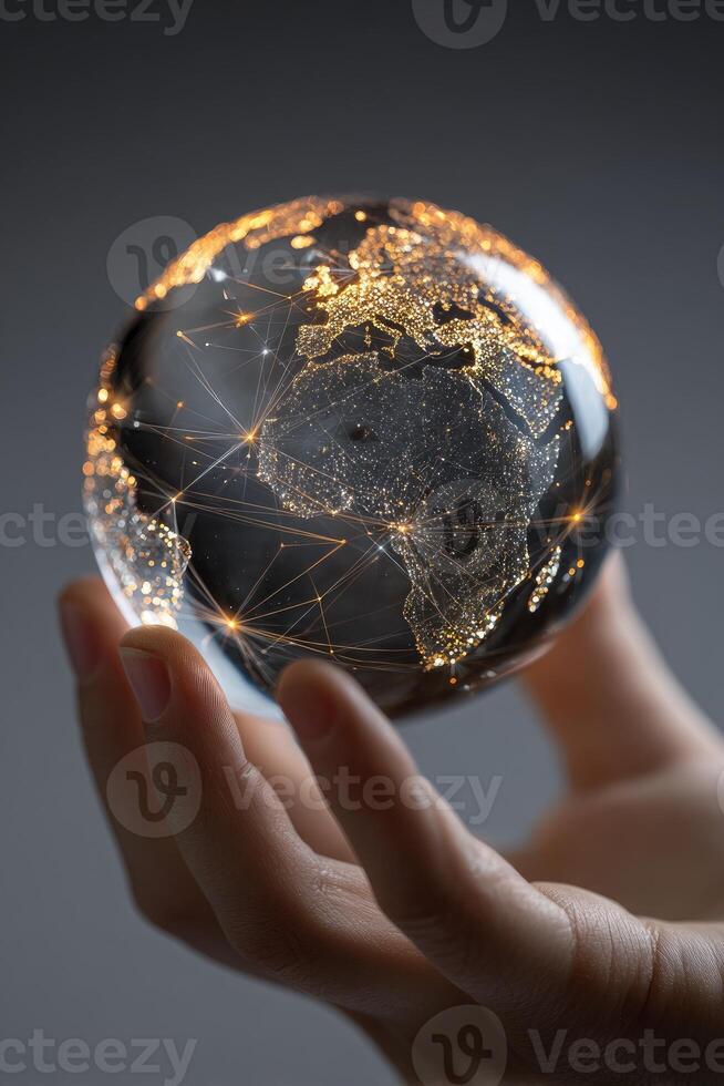 Hand holding a globe with network lines and world map Pro Photo