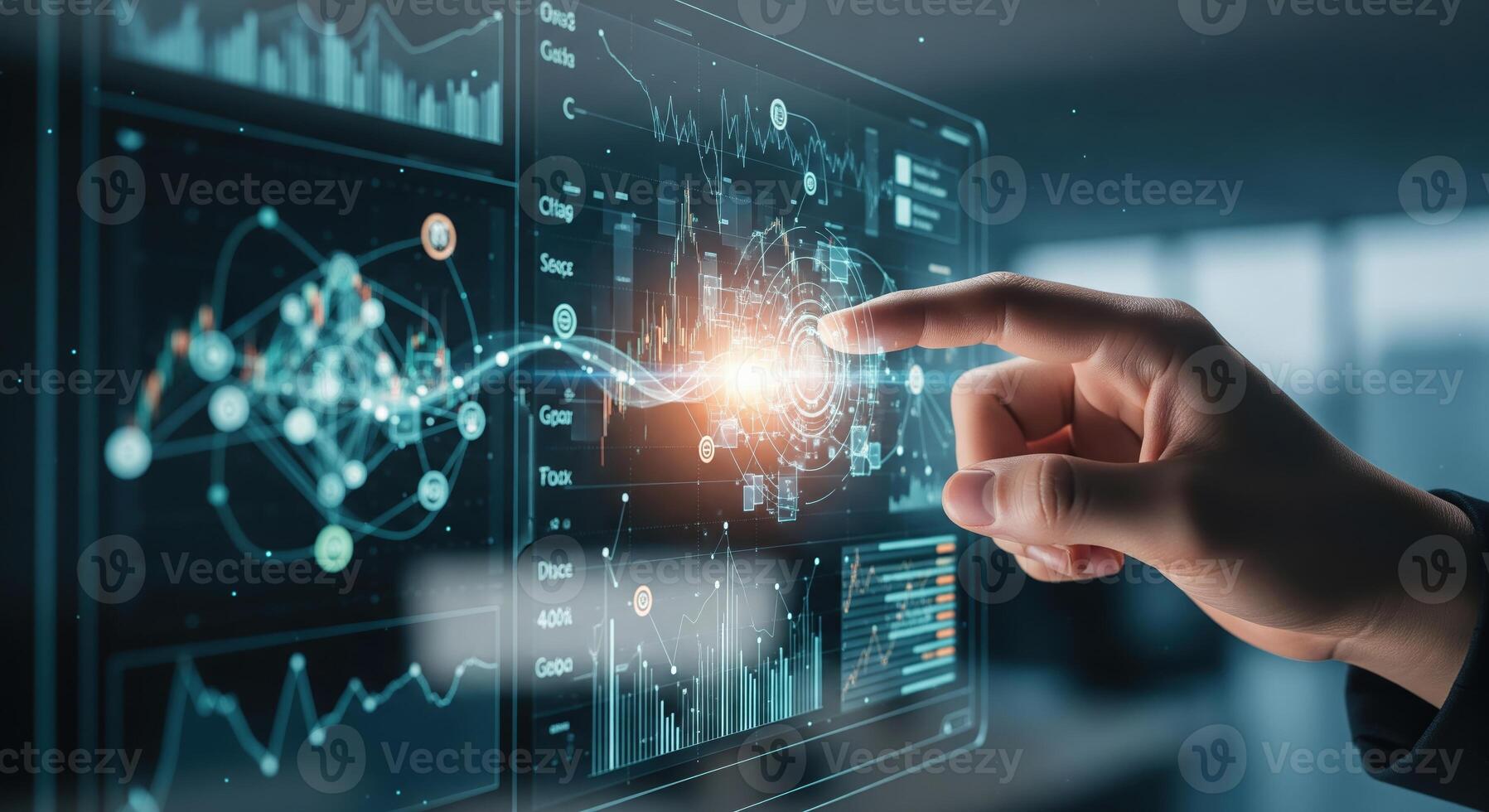 Data Analysis on Interactive Screen with Hand. Pro Photo