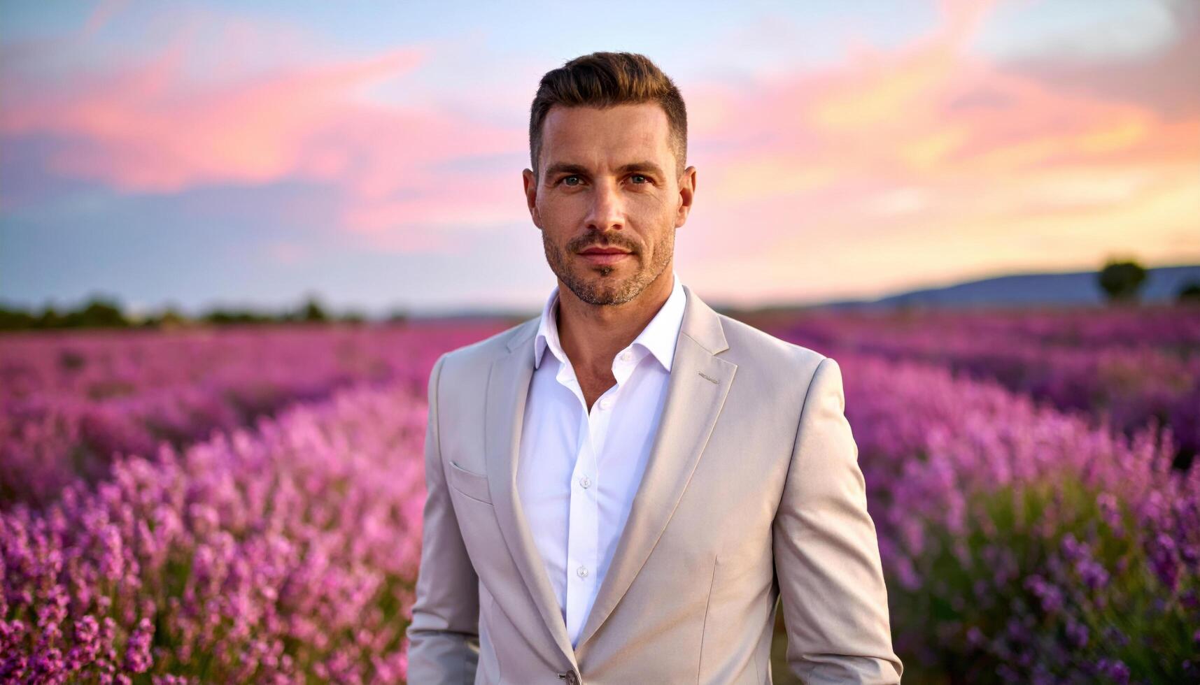 Man in sharp attire stands confidently in lavender field, his gaze fixed on camera with intensity that hints at high fidelity. vibrant colors of sunset enhance serene atmosphere Free Photo