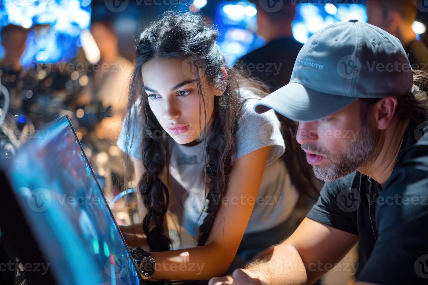 Collaborators engaged in tech exploration at a modern innovation event in the evening Pro Photo