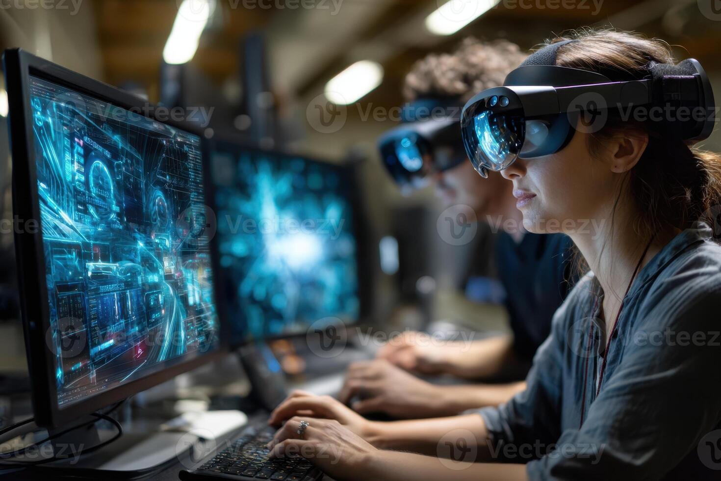 Individuals engage in virtual reality experience in a tech lab setting Pro Photo