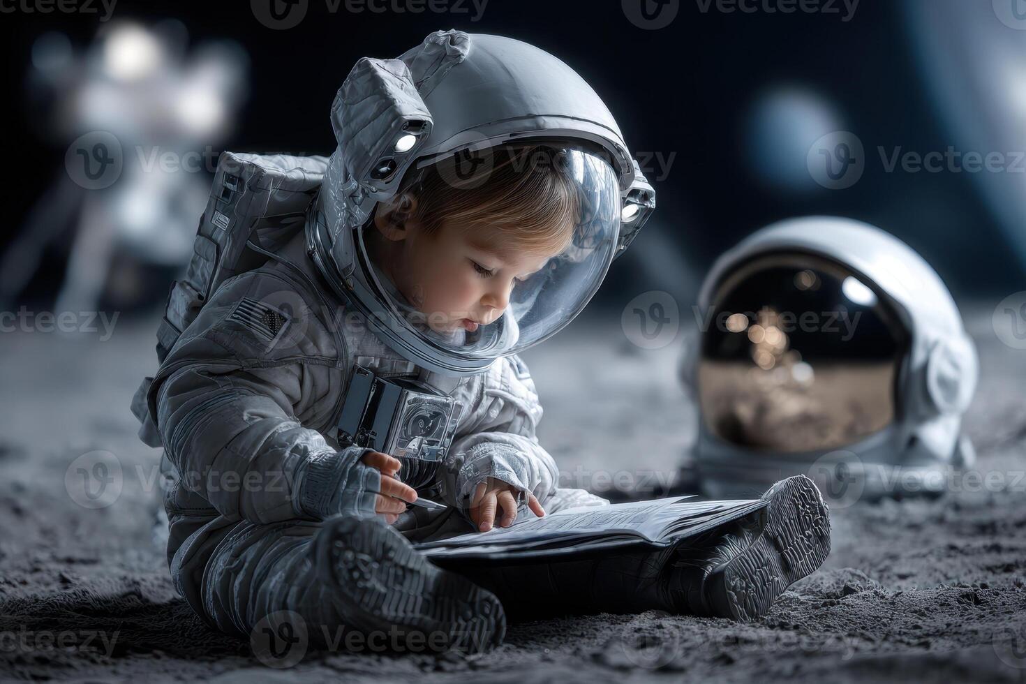 Child in astronaut suit explores space while reading on lunar surface Pro Photo