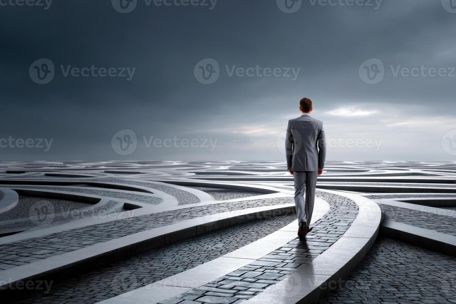 Man walks alone through a complex pattern of paths under a stormy sky Pro Photo