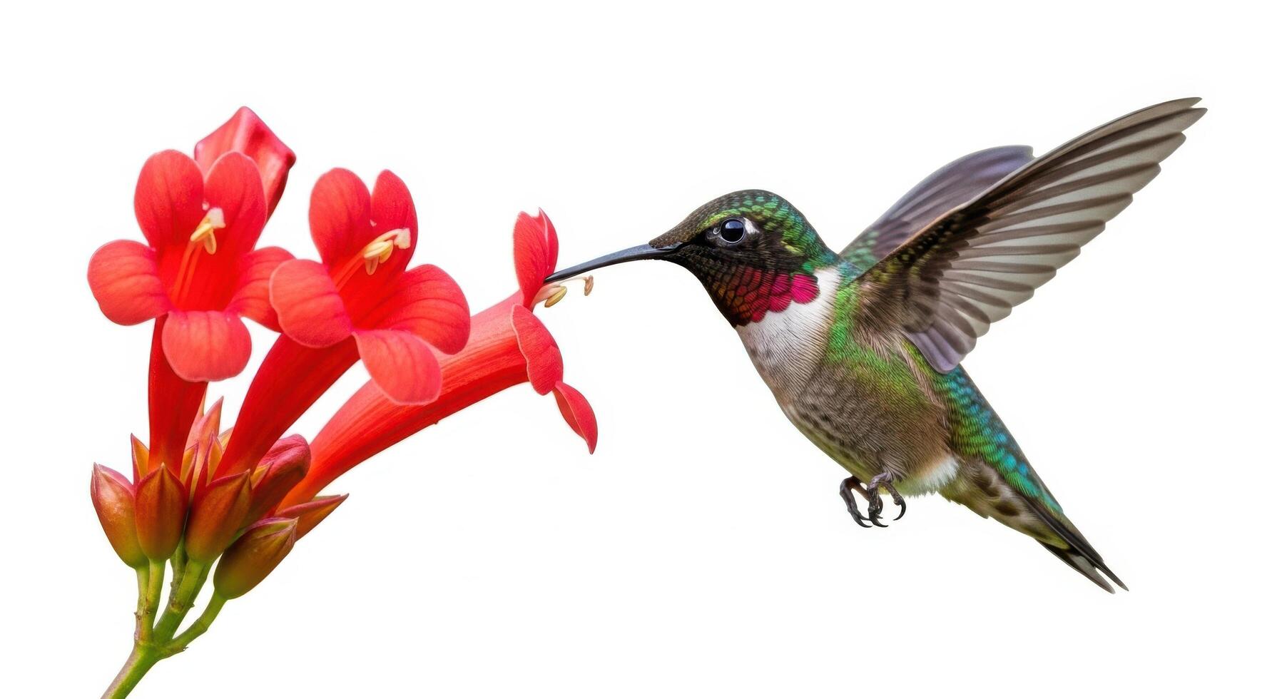 A ruby throated hummingbird isolated on white background is drinking nectar from a red flower Free Photo