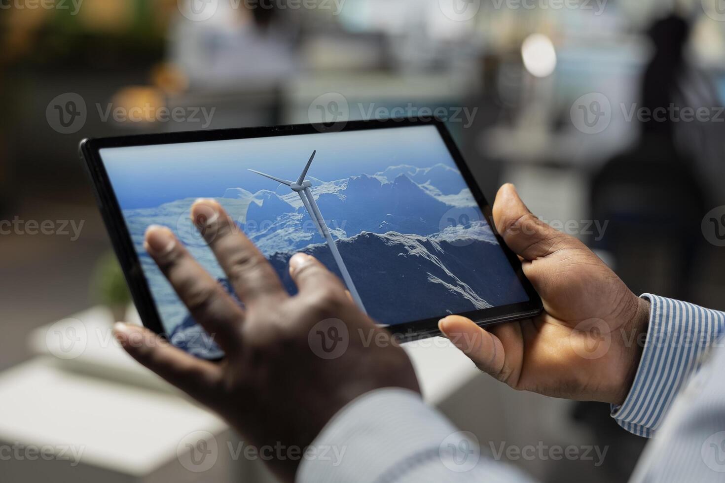 Close up of engineer in office using tablet to analyzes wind turbine and improve renewable energy efficiency. RD professional uses CAD app on device to upgrade windmill, boosting clean energy output Pro Photo