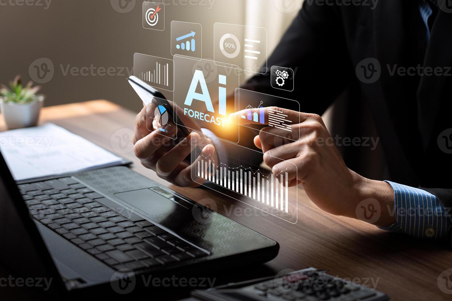 AI forecast and predictive analytics displayed on smartphone screen, businessman analyzing data chart with futuristic dashboard for business strategy, financial planning, and intelligent automation Pro Photo