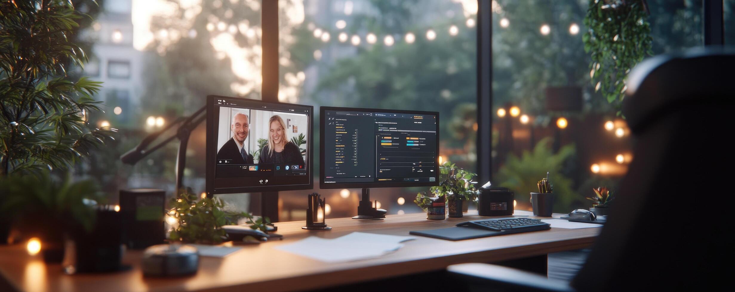 Modern remote workspace with dual screens call and coding technology Free Photo