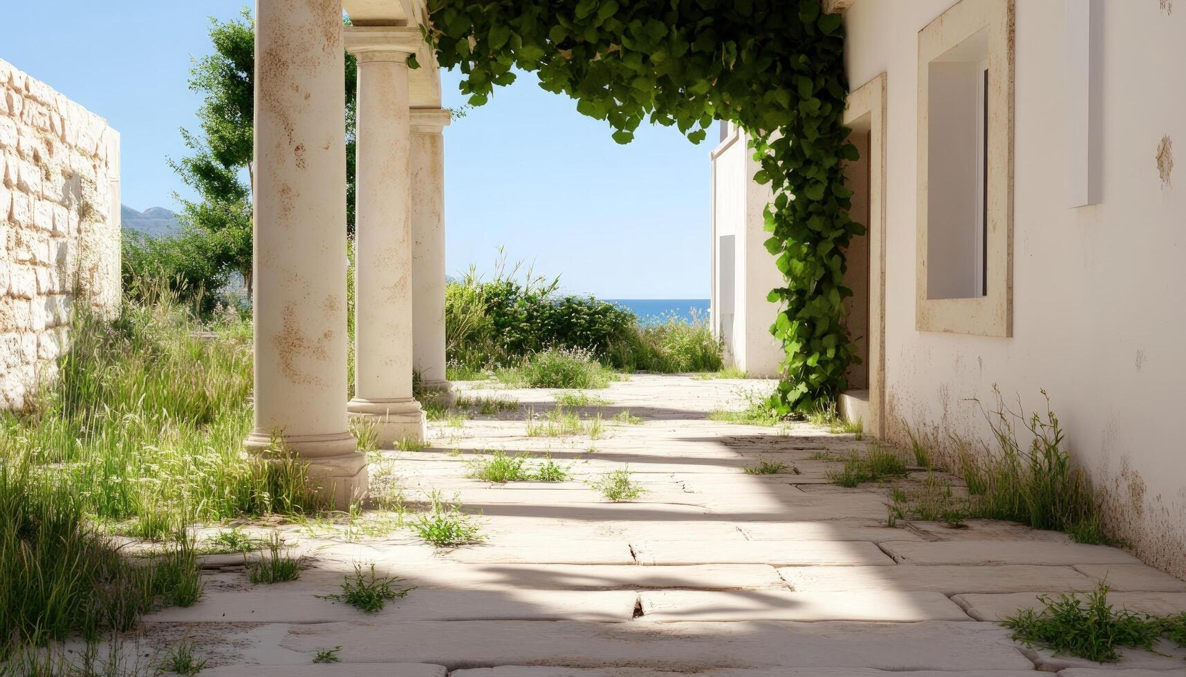 Mediterranean architecture stone path with columns and ocean view Free Photo