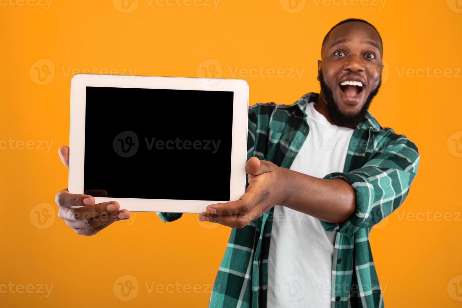 Great Application. Excited Black Guy Showing Tablet Computer With Empty Screen To Camera Recommending New App Posing Standing Over Yellow Studio Background. Digital Tablet Display Mockup For Advert Pro Photo