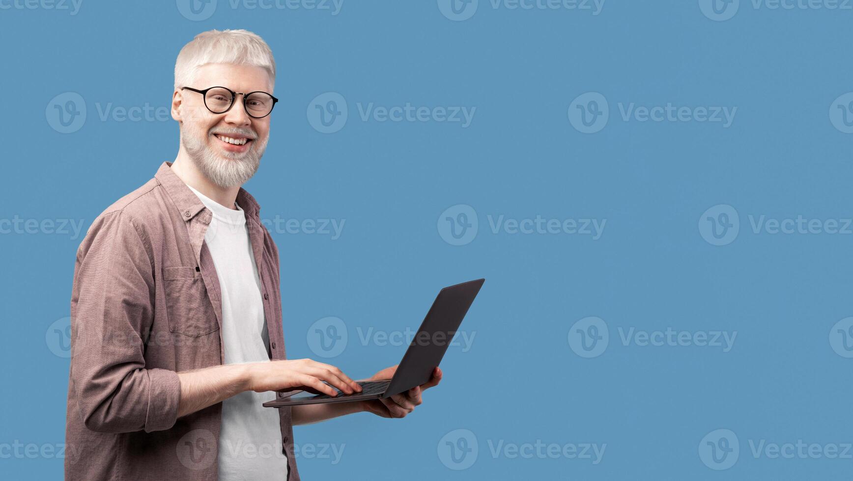Working with joy. Young albino man using laptop and looking with smile to camera over turquoise studio background. Bearded guy with unusual appearance posing with computer Pro Photo