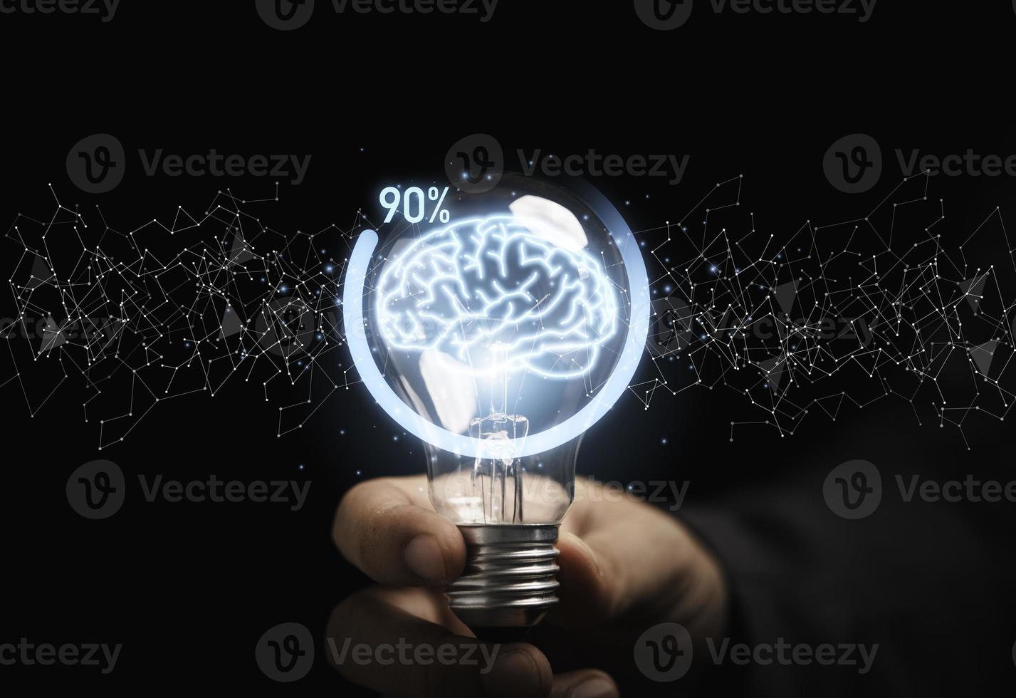 Businessman holding lightbulb with virtual brain and downloading icon progress for creative thinking solution and smart problem solving concept. Pro Photo