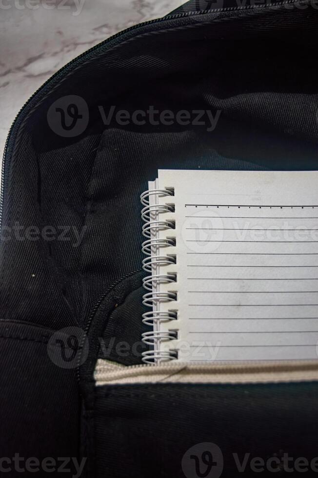 Close up on a spiral notebook with lined pages, partially inside a black backpack. The notebook is white and the backpack interior is beige, creating a monochromatic effect Pro Photo
