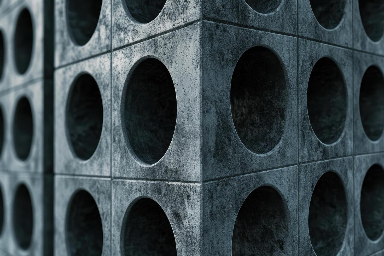 Concrete block structure featuring circular cutouts in urban setting Free Photo