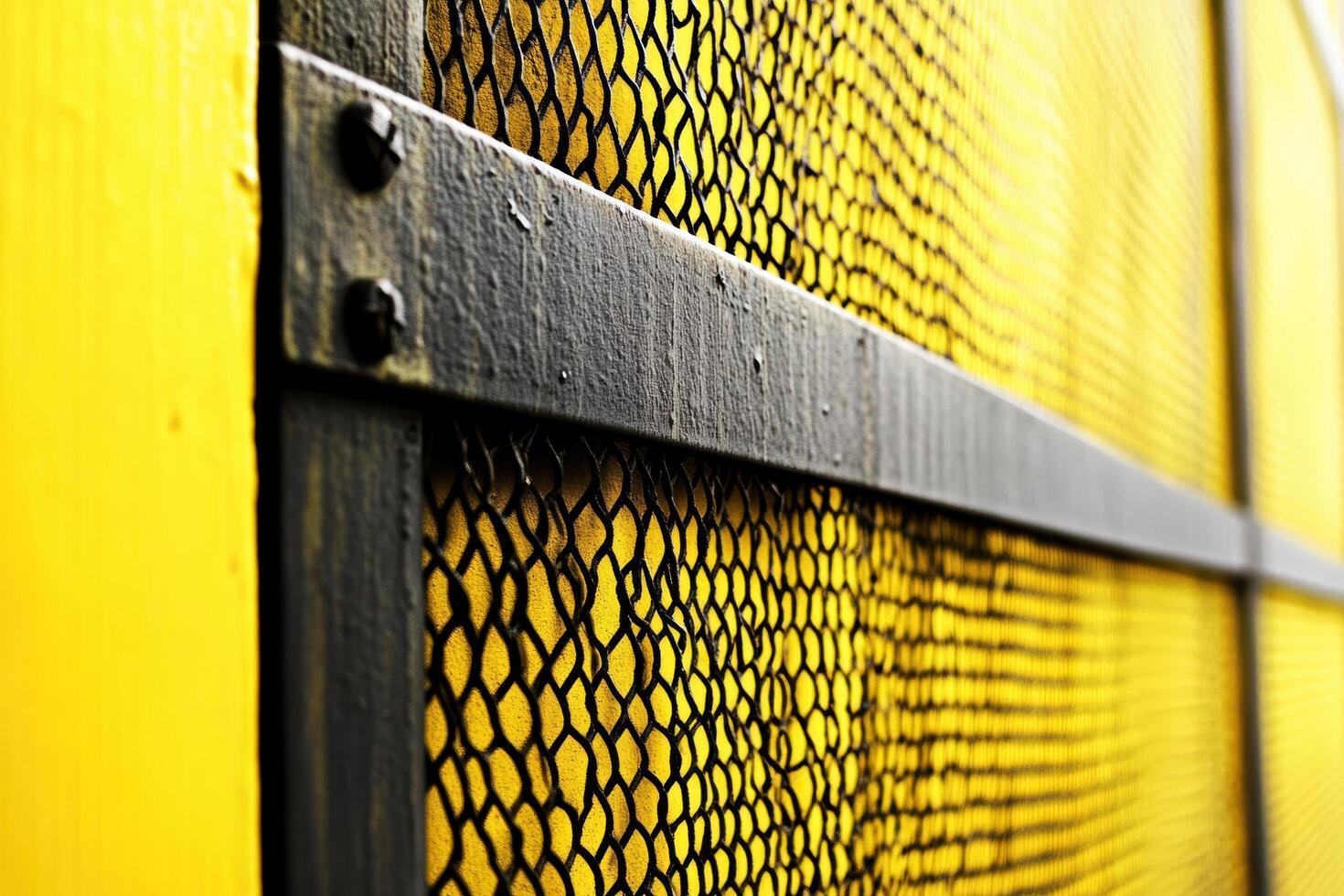 Texture and pattern of a weathered metal mesh against a yellow surface photo
