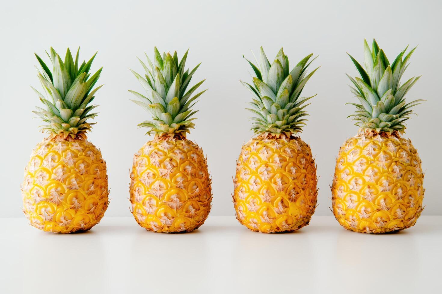 Pineapples lined up on a clean surface with simple background design Free Photo