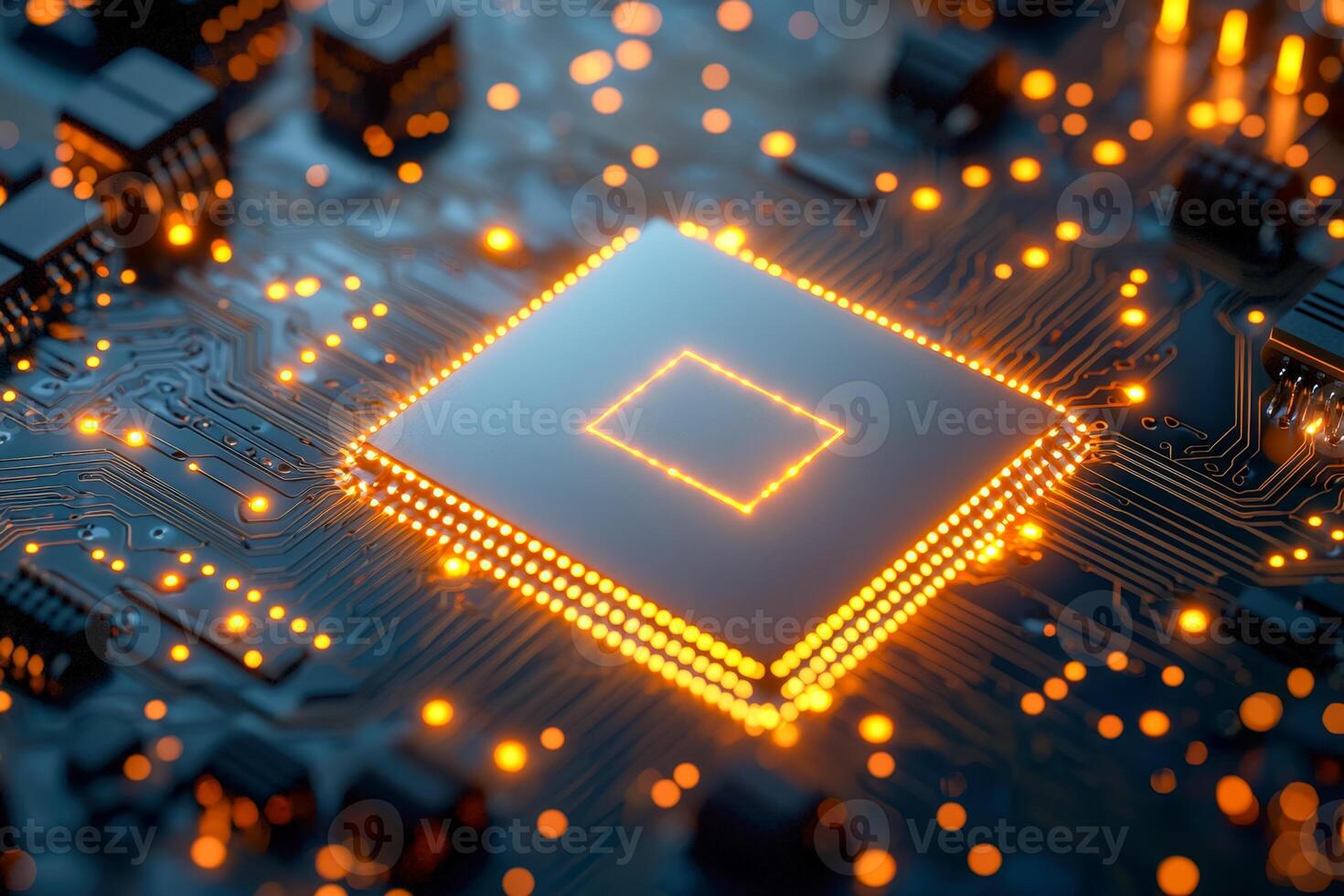 Close-up of a glowing microprocessor on a circuit board, symbolizing computing power, digital technology, electronics, AI innovation, and modern data processing Pro Photo