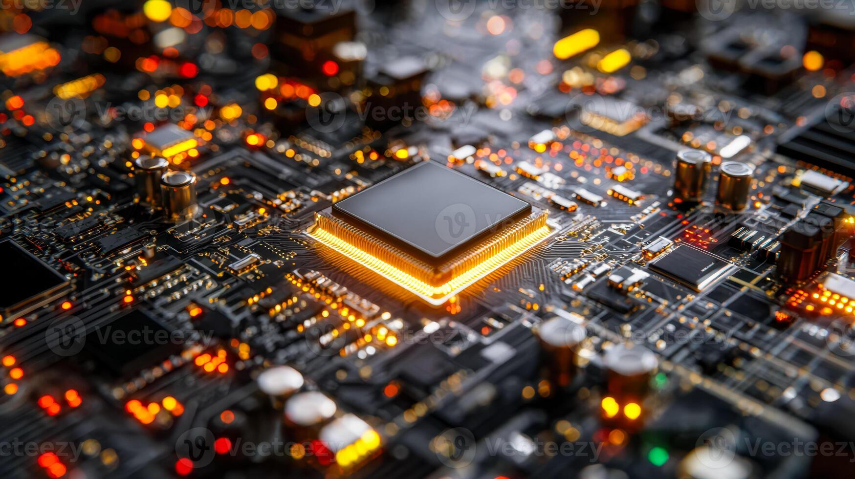 Close-up of a glowing microchip on a circuit board, symbolizing modern technology, computing power, electronics, artificial intelligence, and digital innovation Pro Photo