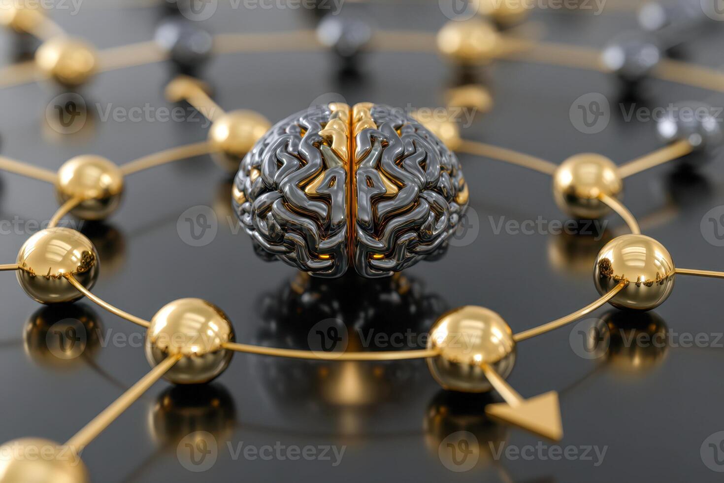 Metallic brain sculpture surrounded by interconnected golden spheres and lines symbolizing advanced neural networks and futuristic technology concepts in dark setting Pro Photo