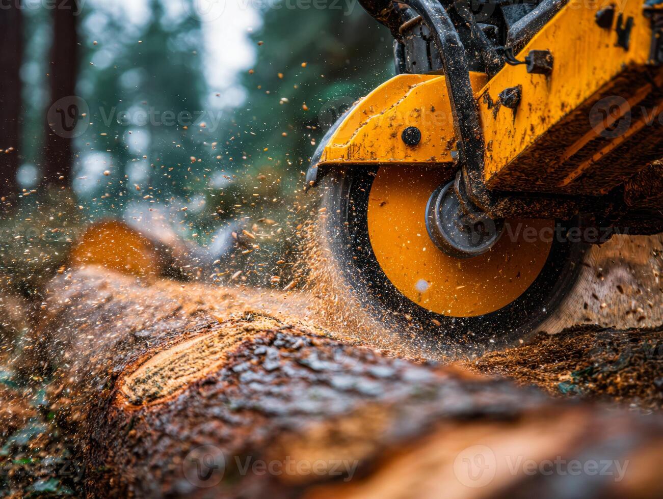 Logging equipment cutting through a large tree in a forest setting Pro Photo