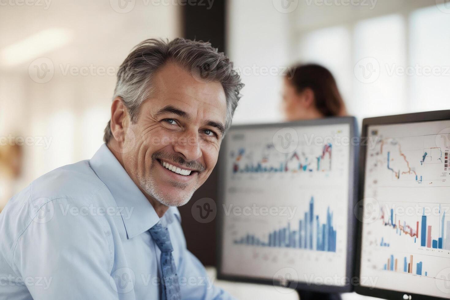 Financial broker is smiling in front of a computer monitor with charts in office Pro Photo