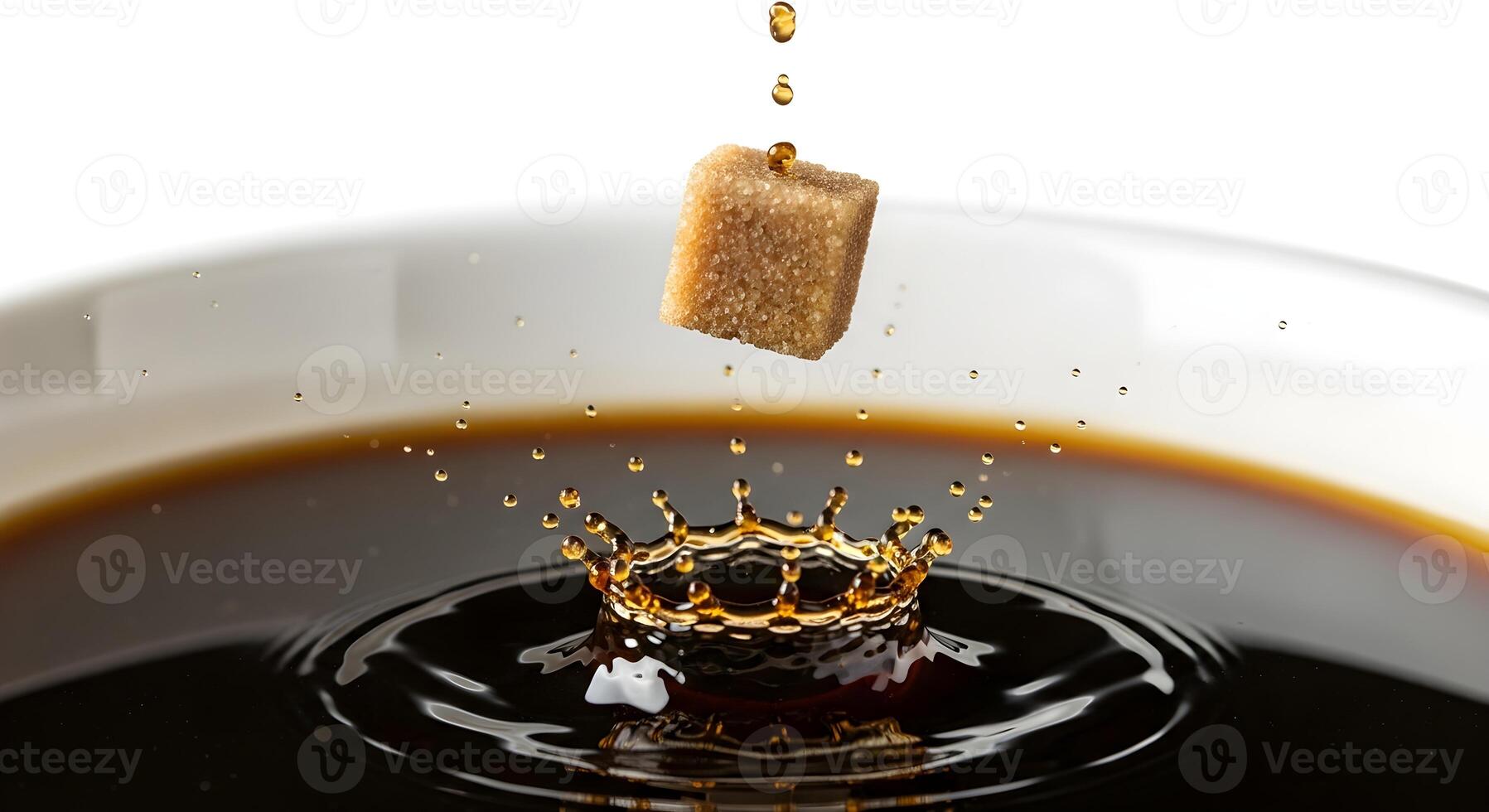 A dramatic macro photograph of a sugar cube splashing into coffee. A dynamic high-speed action shot capturing a tiny, energetic moment, symbolizing a burst of energy or a sweet addition. Pro Photo