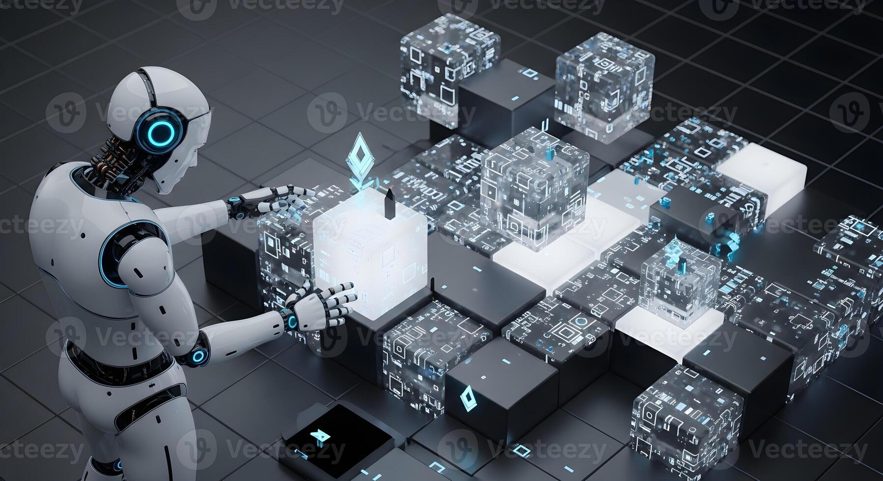 Cybersecurity concept of a robot solving a complex 3D data puzzle, symbolizing encryption, decryption, problem-solving Pro Photo