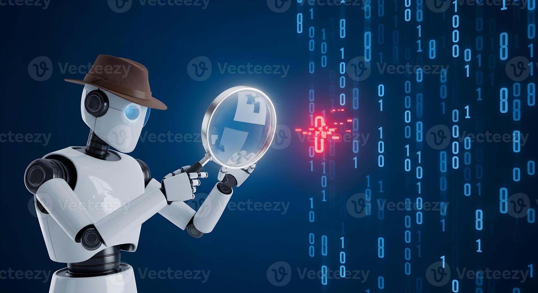 AI data forensics concept showing a robot detective inspecting a corrupted data stream Pro Photo