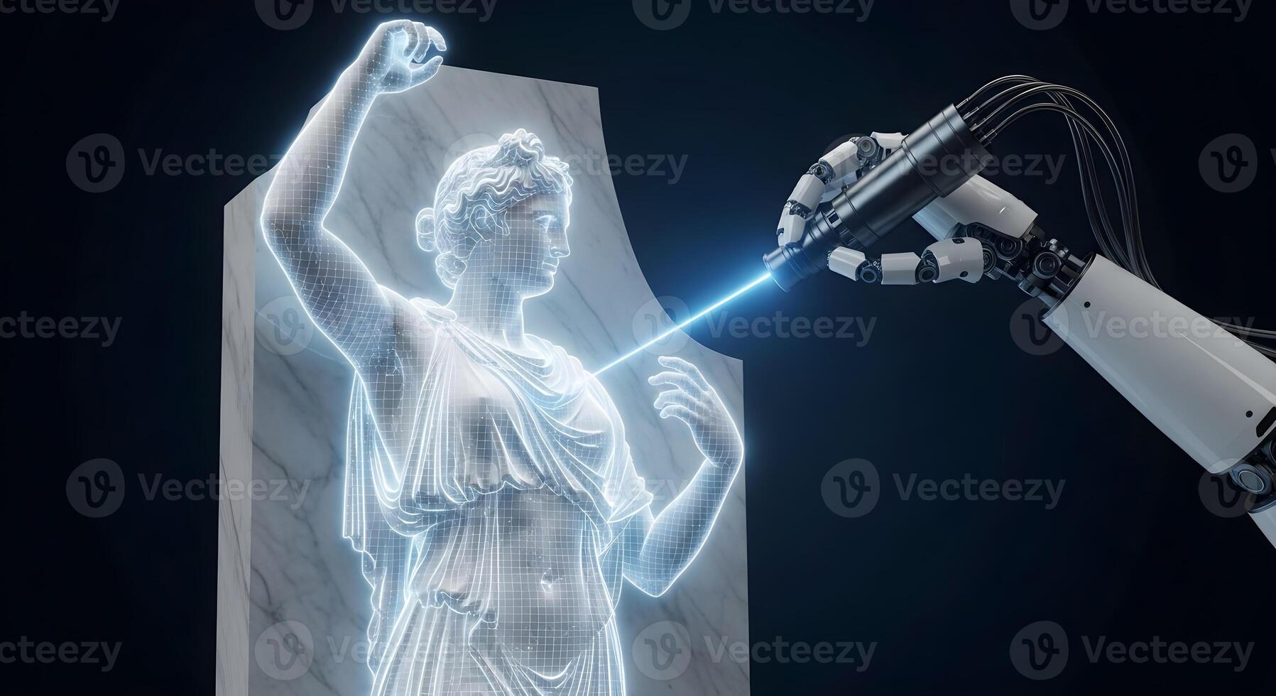 Futuristic AI concept of a robot sculptor carving a classical figure from a block of digital data Pro Photo