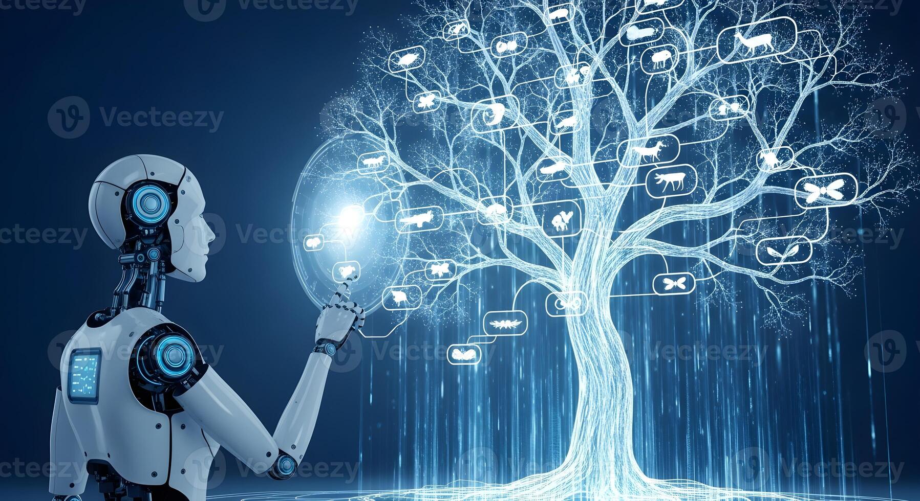 A robot biologist studying a holographic Tree of Life, tracing evolutionary paths with data streams Pro Photo
