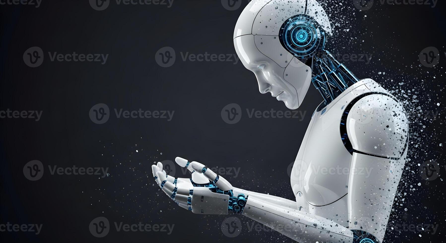 The concept of digital decay or AI memory loss, shown as a robot's hands dissolving into fading data particles Pro Photo