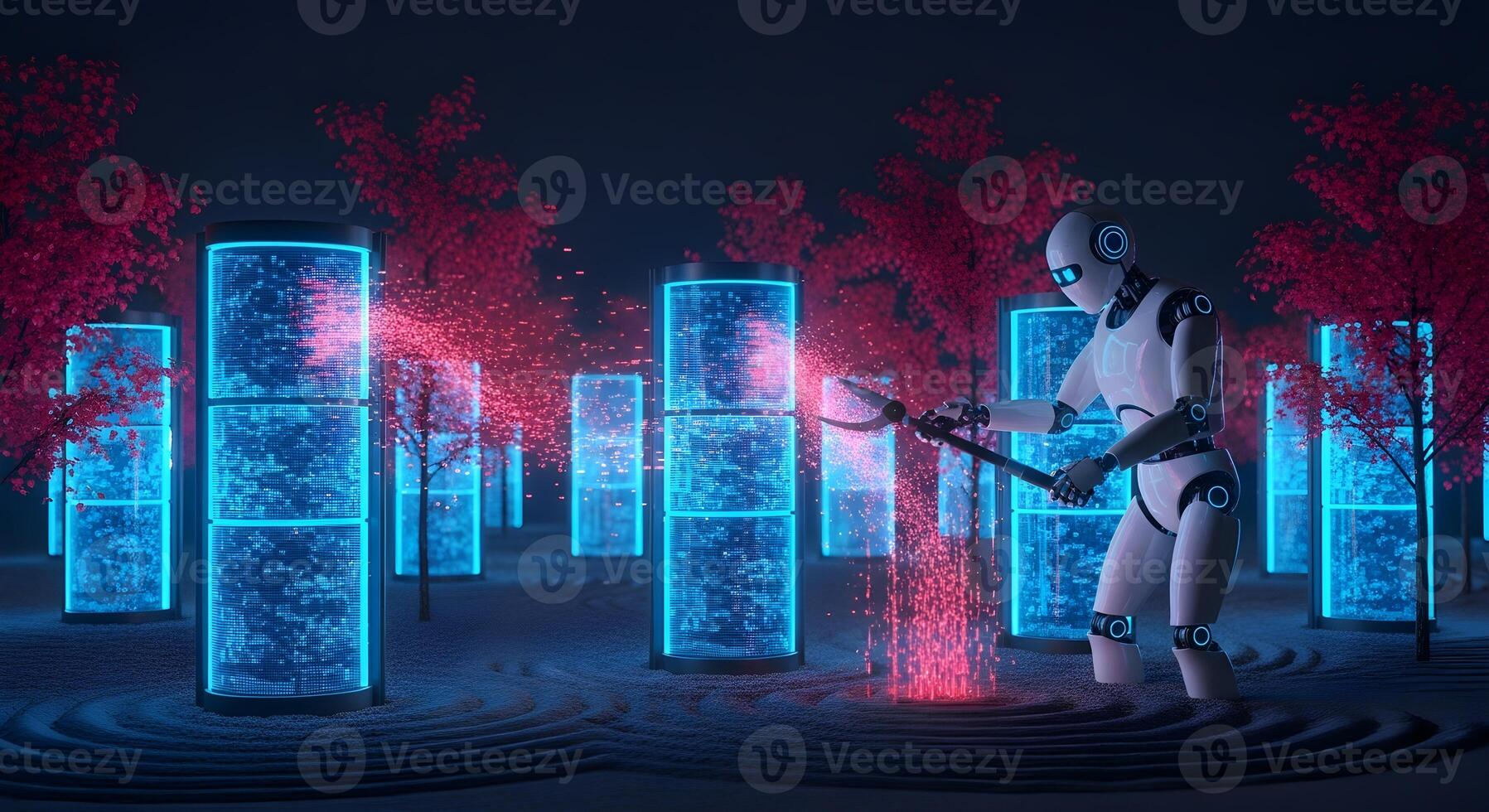A network gardener robot maintaining a server farm, a clean metaphor for system administration, data hygiene, cybersecurity, and the constant maintenance required for stable digital infrastructures. Pro Photo