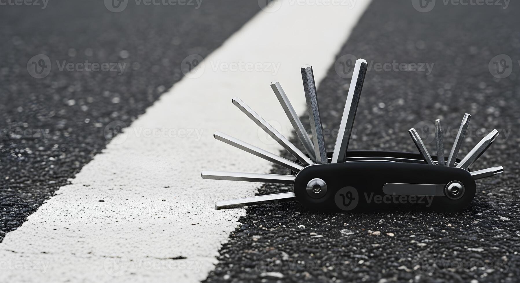 Cycling concept with multitool open to hex and torx shapes on asphalt, featuring white line texture. Captured with natural lighting and deep focus for ultrasharp textures and crisp edges. Pro Photo