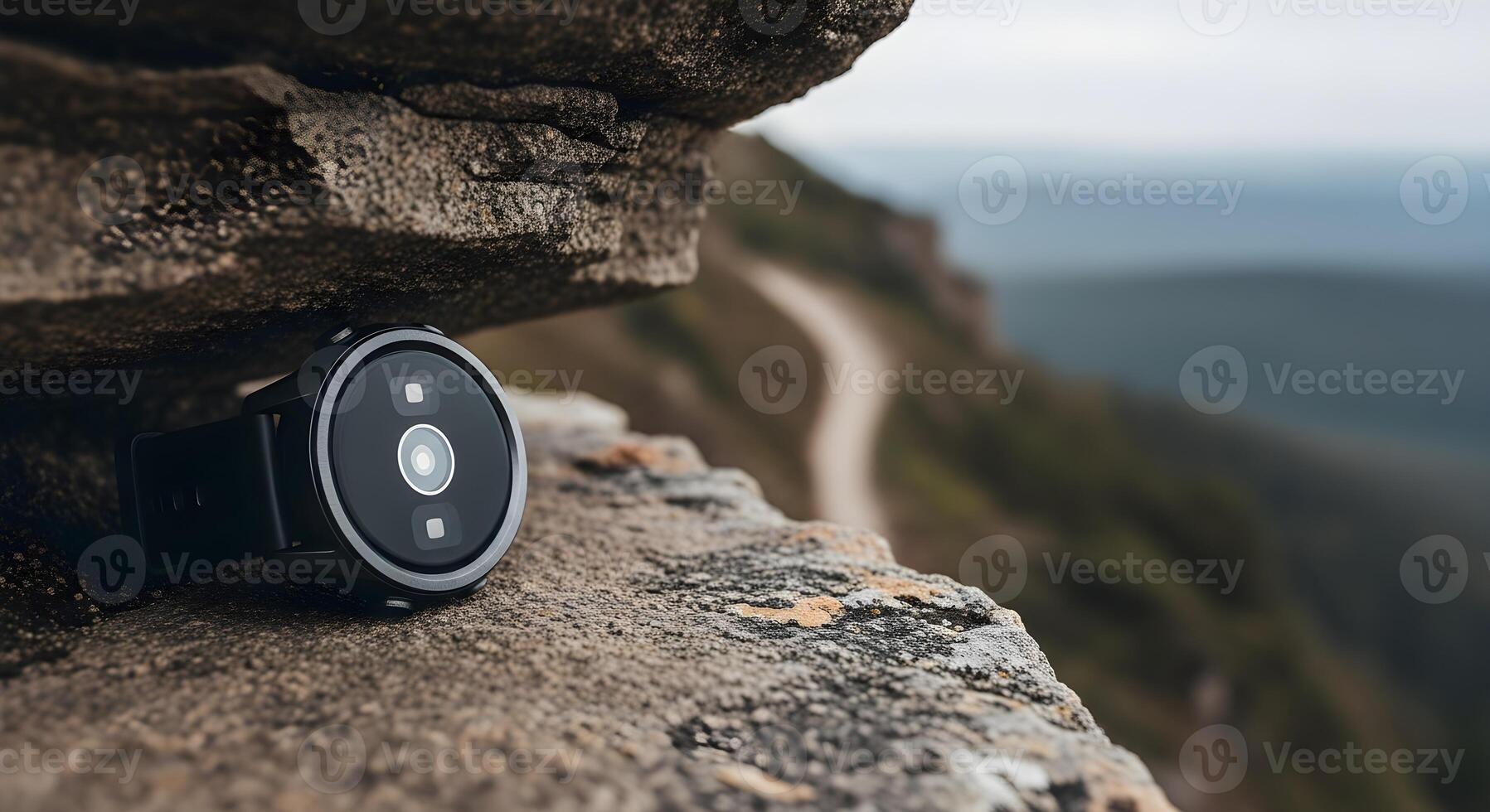 Sport Smartwatch concept with sensor array, side-angled toward viewer, on weathered rock ledge overlooking a trail Pro Photo