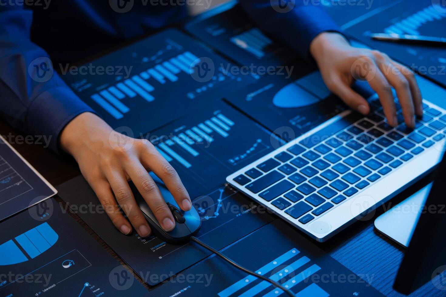 Analyst working late at night analyzing financial data graphs on a laptop computer in a dimly lit office, illuminated by blue light, showing dedication and focus Pro Photo