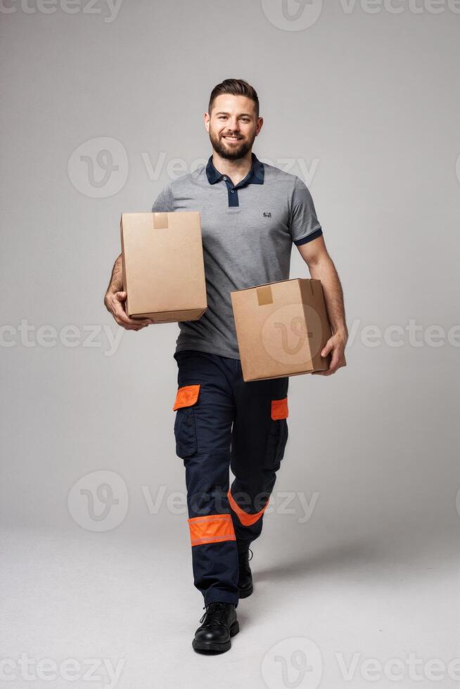 Delivery worker carrying boxes while walking indoors with a cheerful expression in a modern setting Pro Photo